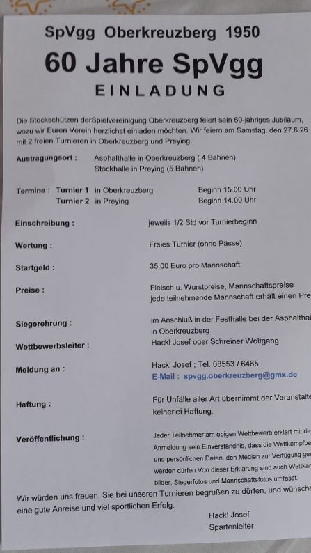 | 34 | 18.08.-24.08. | 23.08.2025 | 09.00Uhr | Fritz Koller Gedächtnisturnier | Oberkreuzberg | Ossi, Andi, Beer, Schneider | 2.Platz / Finalschießen | Ausschreibung | Ergebniss | |||||